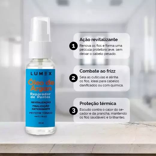 O Reparador de Pontas Lumex com Óleo de Argan é um poderoso antioxidante que retarda o envelhecimento dos fios. Revitaliza, formando uma película protetora sem engordurá-los. Cabelos cacheados ou quimicamente tratados têm mais facilidade de formar pontas bipartidas.